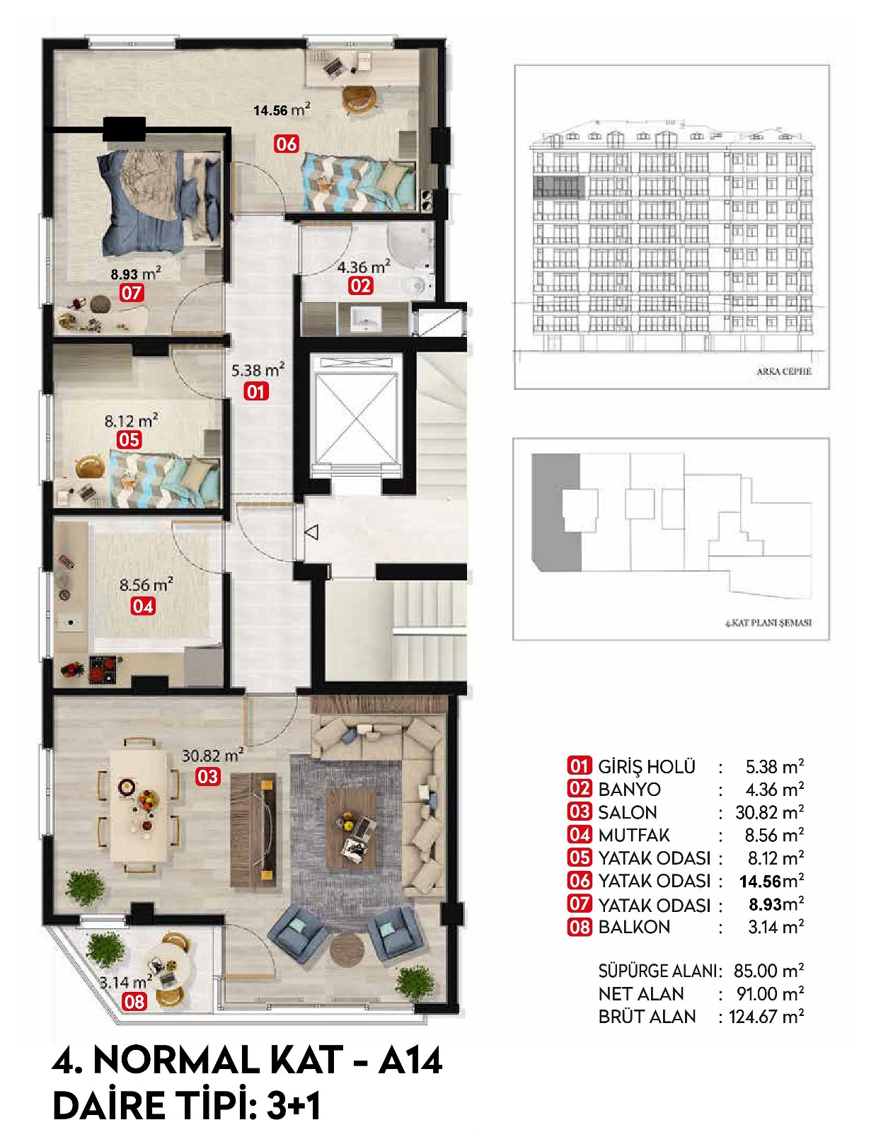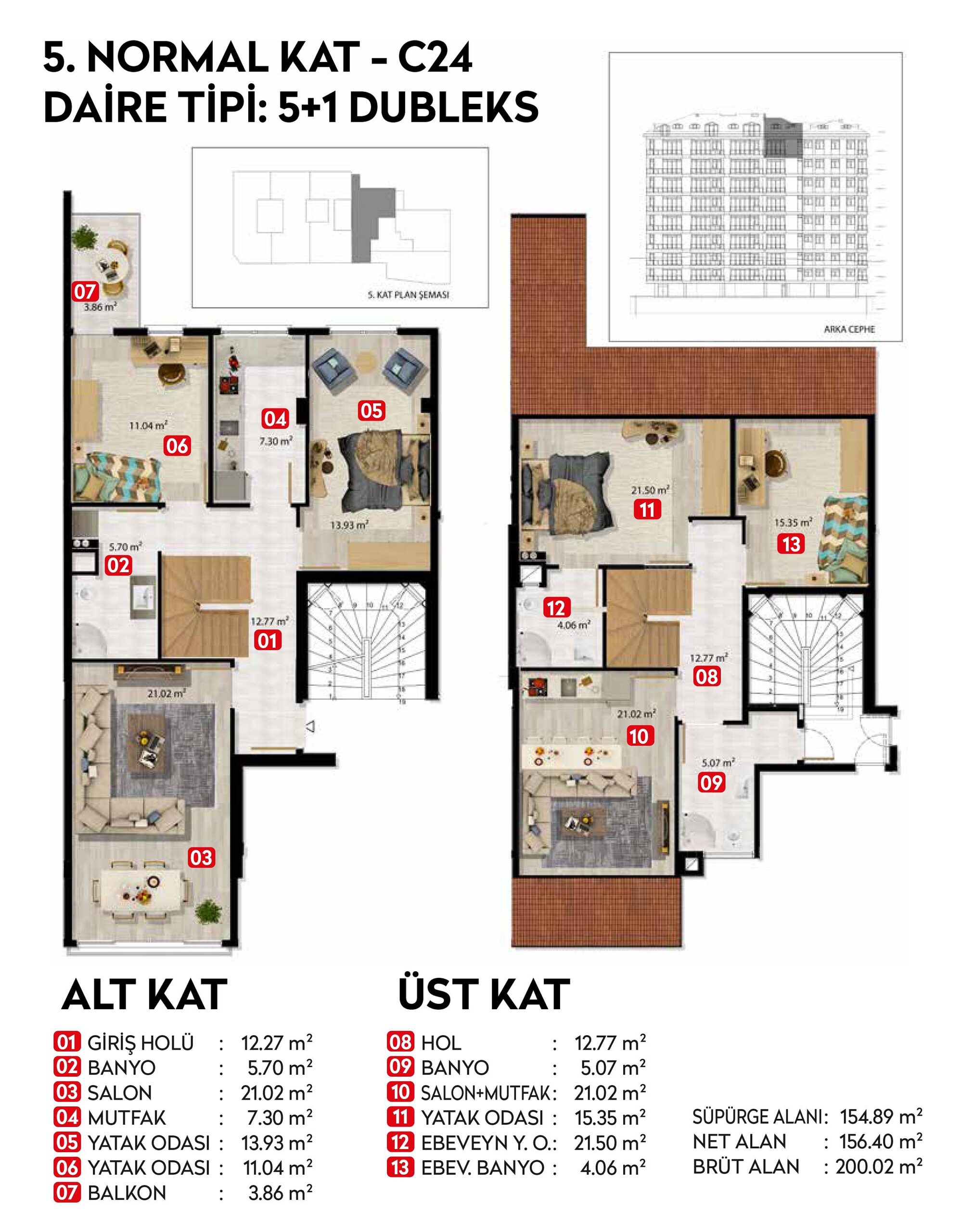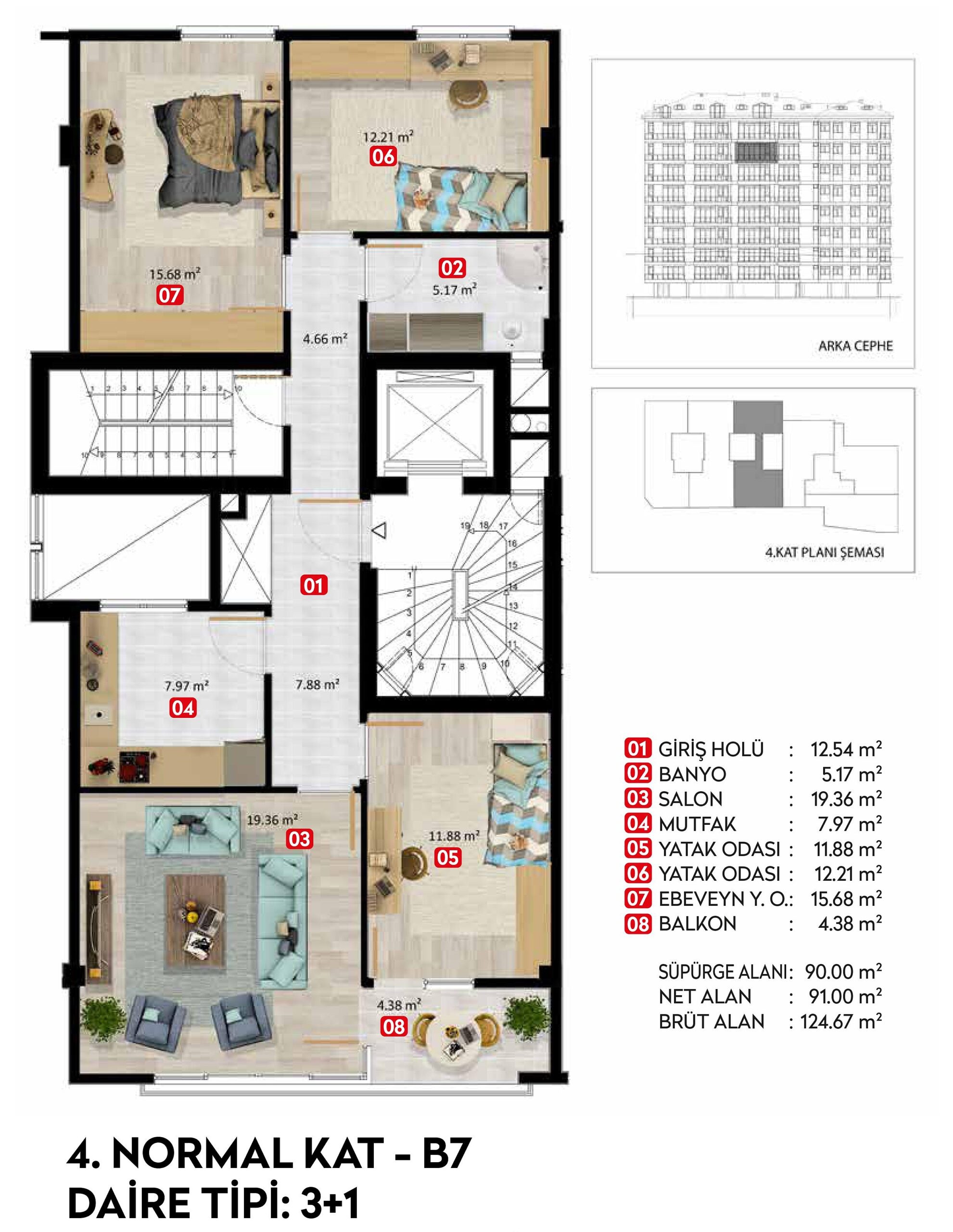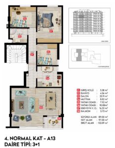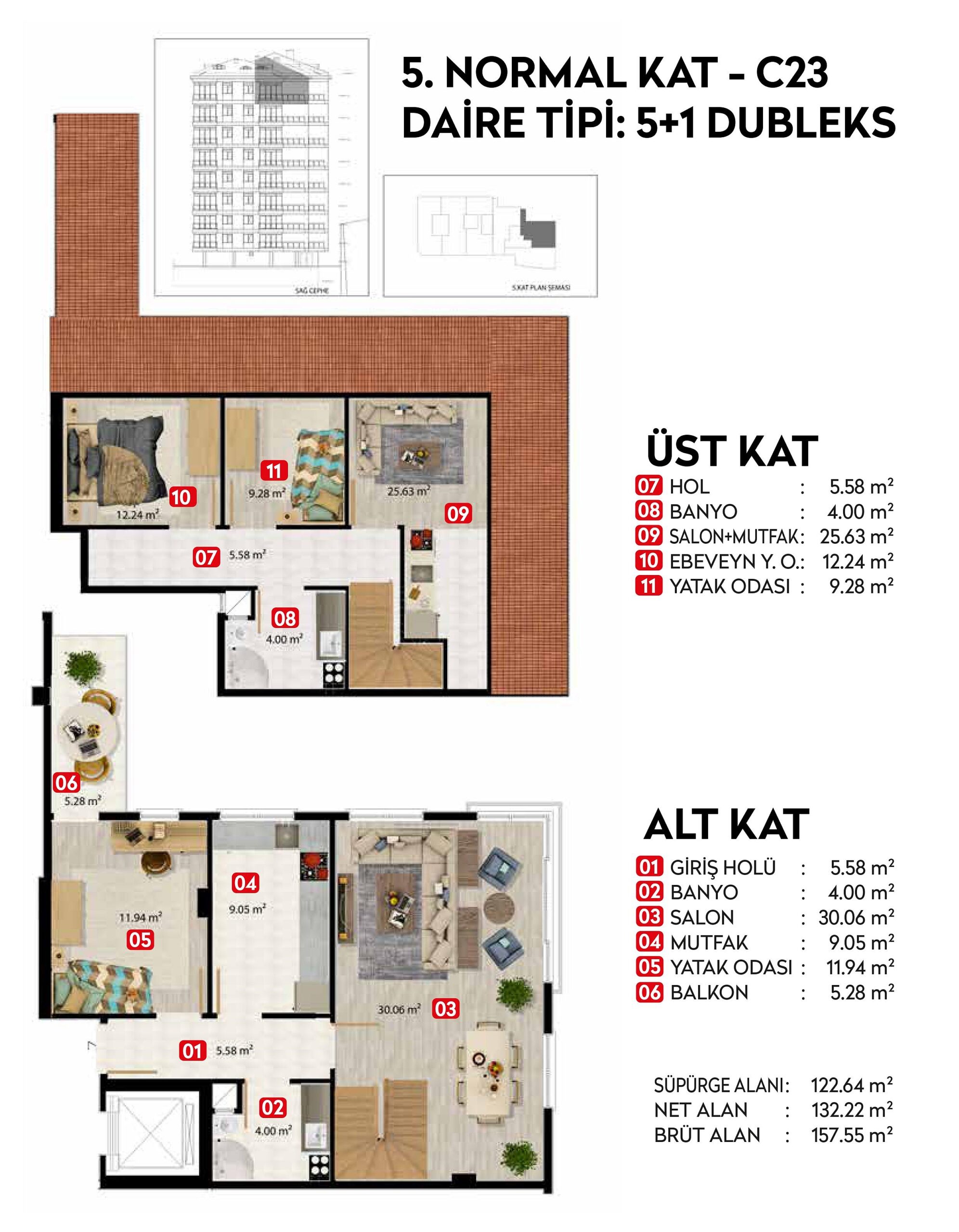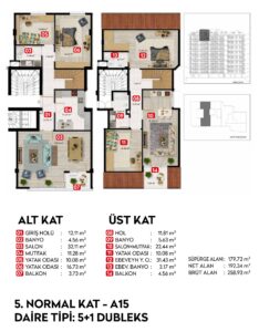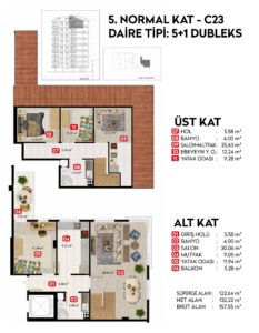 On the upper floors, the project features 2+1 duplex apartments of 117.22 m², notable for their spacious and functional design. For larger families, there are 3+1 apartments ranging from 158 m² to 200.36 m², combining luxury and comfort. These units promise an ideal living space with expansive living rooms, airy bedrooms, and modern design. Each apartment is designed with a focus on aesthetics and functionality.
